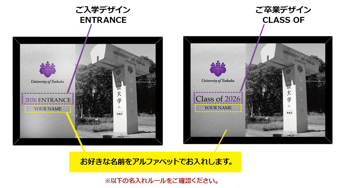 このパネルに2026の年号とCLASS OFまたはENTRANCEの表記と個人名が入ります。